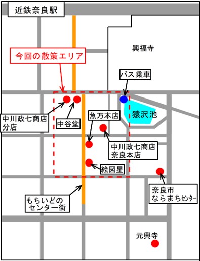 本ページの地図において赤色の破線内のエリアを、最初から最後までご自身のペースで自由に散策していただくコースです。散策の時間が終了したら、猿沢池付近に集合していただき、バスに乗車します。